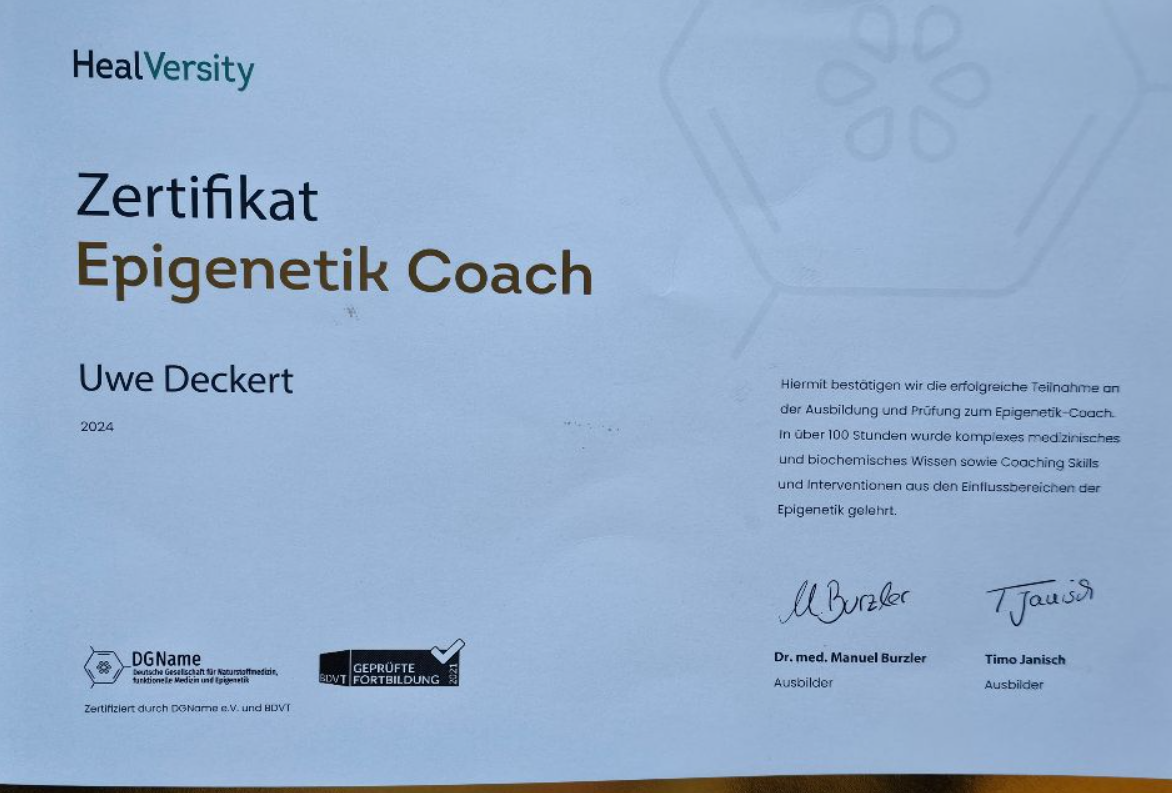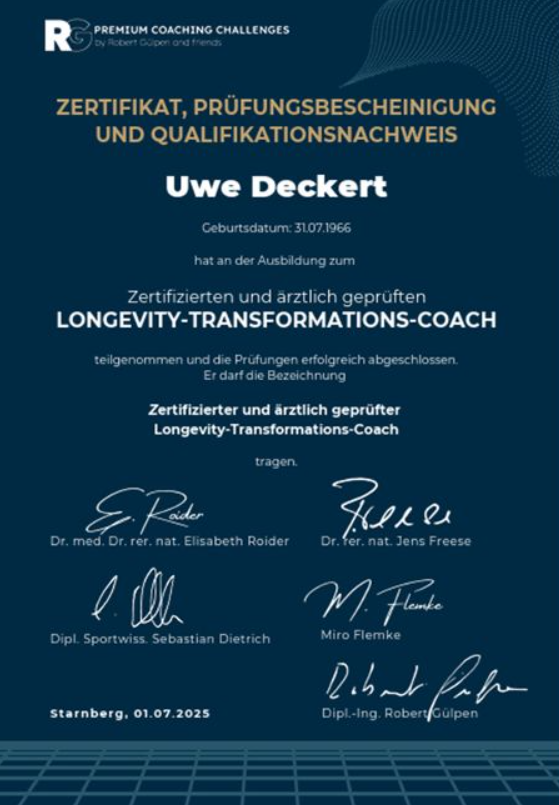 Ich bin Uwe Deckert – zertifizierter und ärztlich geprüfter Longevity-Transformations-Coach sowie Epigenetik Coach.